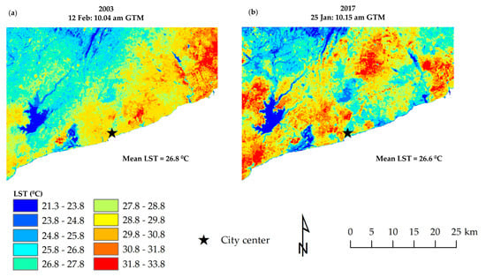 Land surface temperature (LST) maps of Accra: (a) 2003 LST map; and (b) 2017 LST map.