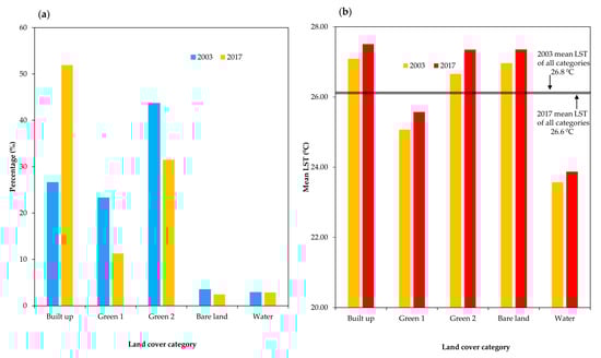 (a) Percentage of land cover categories (LCCs) and (b) mean LST of LCCs.