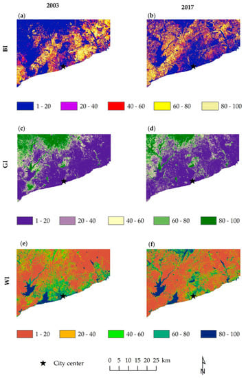 The TCT maps and the result of correlation analysis are shown in Figure 5 and Appendix A. In 2003, BI was mostly accumulated in the eastern areas; GI was mainly accumulated in the northeast direction from the city center, and WI was concentrated in the surrounding zones of the city center. However, in 2017, BI was spread out widely (Figure 5), corresponding with the Built up category of the LUC map (Figure 2), and GI did not become more extended. We used 20,000 random sample points to identify the relationship between the density of Built up, Green 1, and Green 2, as well as BI, GI, WI, and mean LST. The results showed a positive correlation (r = 0.451 in 2003 and r = 0.541 in 2017) with BI and mean LST and negative correlation (r = −0.623 and r = −0.207 in 2003 and r = −0.380 and r = −0.689 in 2017) with GI, WI, and mean LST (Appendix A). All correlation results were significant at the 0.01 level of confidence.