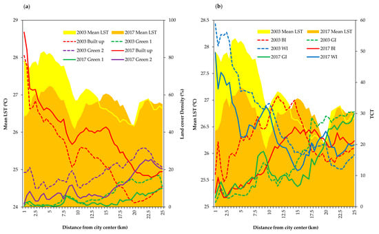 Urban-rural gradient analysis; (a) Mean LST and land cover density; (b) Mean LST and TCT.