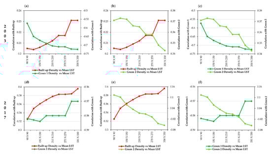 The multiresolution grid-based analysis explored that Built up density and Green 2 density were most associated with the raising of the LST (Figure 7). However, Green 1 was the most relevant cooling effect on the LST. Estoque et al. (2017) [11] found similar results using the data on an impervious surface and green space in three megacities in Southeast Asia (a suitable grid size was 210 × 210, and 240 × 240 for Bangkok, Jakarta, and Manila and all results were statistically significant at the ( < 0.001). Xiao et al. (2007) [47] made clear that the relationship between impervious surface and mean LST became stronger while grid size enlarged around 30 m to 960 m. All of the correlations were significant ( ≤ 0.05).