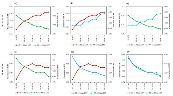 Multiresolution grid-based analysis. The correlation coefficient between BI, GI, WI, and mean LST: (a) BI vs. GI in 2003; (b) BI vs. WI in 2003; (c) GI vs. WI in 2003; (d) BI vs. GI in 2017; (e) BI vs. WI in 2017; (f) GI vs. WI in 2017.