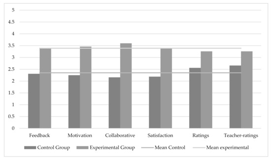Upon the results acquired from the present study, it has been proven that differences exist between the means provided by the students developing the pedagogical strategy of CW and those developing it through IW. This is based on the fact that the means of the CG are located below 2.5, which implies a low-intermediate marking tendency. For the CG, the most valued dimensions have been ratings and teacher-ratings. By contrast, for the EG, high-intermediate tendencies have been found as the means are located above 2.5. In addition, for the EG, the least valued dimensions have been ratings and teacher-ratings. Nevertheless, there are no significant differences with the means of the rest of the dimensions of the EG, all being in tune with that noted by [50].