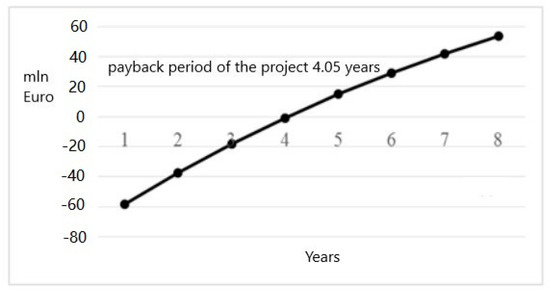 The model also needs to take into account the constraints (9–11). As a result of problem-solving (13)–(15), (9)–(11), the optimal design maneuver of the mining company will be found. Such set of alternative options for the project’s implementation supposes the possibility of the deviations from the best values of the criteria (7), (8) but within achievable limits. It should be noted that it is possible to determine the project maneuver for different weights of the optimality criteria and . This will lead to an increase in one optimality criterion by reducing the other.