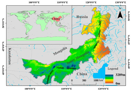 Inner Mongolia is located on the northern border of China, with Mongolia and Russia to the northwest (Figure 2). Inner Mongolia has been described as the “the environmental Great Wall” of northern China and acts as an important environmental barrier in the Beijing Tianjin Tang region. This region is known as the “Magic Bowl” due to its abundant aboveground and belowground resources and is a strategic area for national energy security and environmental security strategies. Thus, the need to balance large-scale exploitation of mineral resources with the protection of the prairie environment is essential. As a result, a sharp contrast exists between development and environmental protection in Inner Mongolia. Since the overall regional development of the region remains low, there is a need to strengthen regional infrastructure, particularly transportation infrastructure. The economy of Inner Mongolia, which has developed rapidly in recent years, relies heavily on abundant natural resources, and there has been a significant improvement of infrastructure. However, continual economic development in the region may result in the capacity of the environment to support the range and degree of exploitation being exceeded, resulting in environmental problems such as water pollution, resource depletion, dust storms and environmental destruction. The contradiction between the needs of the people and the carrying capacity of the land in the region is becoming increasingly acute. Within this context, there is an increasing focus on traditional regional development modes in the region with a gradual shifting of focus to the concept of sustainable development. This development falls in line with the global recognition of reasonable protection and the orderly development and utilization of limited resources to ensure human survival and sustainable development.