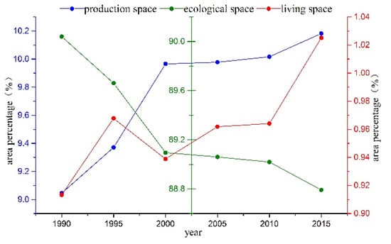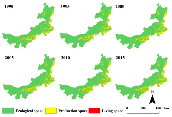 Figure 3 shows the spatial distribution of ecological, living and production spaces of Inner Mongolia for six different periods from 1990 to 2015. Grassland is the dominant land use type in Inner Mongolia due to the prevailing climate, topography and other natural conditions. The proportions of production, ecological and living spaces in Inner Mongolia in 2015 were approximately 10.18%, 88.79% and 1.03%, respectively and ecological space was the priority. The ecological space of Inner Mongolia is mainly distributed in the grassland and hilly areas to the north of the Greater Hinggan–Yinshan–Helan mountains, with a spatial distribution roughly inverse to that of living and production spaces. The production space of Inner Mongolia is mainly distributed to the south of the Greater Hinggan–Yinshan–Helan mountains, with that of the Hulunbeier Caoyuan and Alxa Desert area being relatively small and basically consistent with the boundary zone of animal husbandry and agriculture in Inner Mongolia. The main reason for the relatively small production space in Inner Mongolia is due to its location to the north of the three mountains in an area in which soil, precipitation and temperature conditions are not suitable for large-scale production activities. The living spaces of the Hubaoe urban agglomeration in the central part of the Inner Mongolia, Chifeng and Tongliao areas in the east are relatively concentrated.