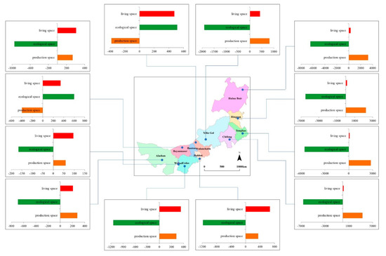 Figure 5 shows the spatial changes in EPLS for the 12 leagues of Inner Mongolia over the period 1990 to 2015, in which there are obvious regional differences. Among the 12 league cities in Inner Mongolia, only Ulanqab and Bayannur showed increases to the extent of ecological space, whereas decreasing trends were evident in the remainder. Among them, the cities of Chifeng and Hulunbeier showed the largest declines, reaching 6636 and 6436 km2, respectively. Hohhot, Ordos and Ulanqab showed the greatest increases in ecological space at 672, 531 and 474 km2, respectively, whereas the city of Wuhai had the smallest increase at 96 km2. Production space in Bayannur and Ulanqab decreased by 400 and 383 km2 respectively, whereas increases were evident in the city of Hulunbeier, the league of Hinggan and the cities of Tongliao and Chifeng of 3297, 2247, 2766 and 3297 km2, respectively. In general, living spaces in the central and western regions increased, ecological spaces decreased and production spaces in the eastern region increased.