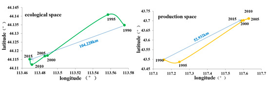 - Production space showed the largest Barycenter migration distance of 190.509 km from 1990 to 2015, with the center moving southwest. Ecological space showed the second-largest Barycenter migration distance.