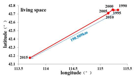 The center-of-gravity transfer trajectory of EPLS in Inner Mongolia from 1990 to 2015 was calculated using the center transfer formula, with the results shown in Figure 6. It is evident that the center of gravity of EPLS in Inner Mongolia changed from 1990 to 2015. The center of gravity of living space showed the greatest migration, whereas that of production space showed the smallest. The trajectory of the center of gravity of ecological space in Inner Mongolia showed an “S” shape from 1990 to 2015, and the center of gravity of ecological space moved 104.228 km to the southwest, with the migration not obvious from 1990 to 2010, but accelerating subsequently. Over the same period, the center of gravity of production space in Inner Mongolia moved 52.932 km to the northeast, whereas that of living space moved 190.509 km to the southwest.
