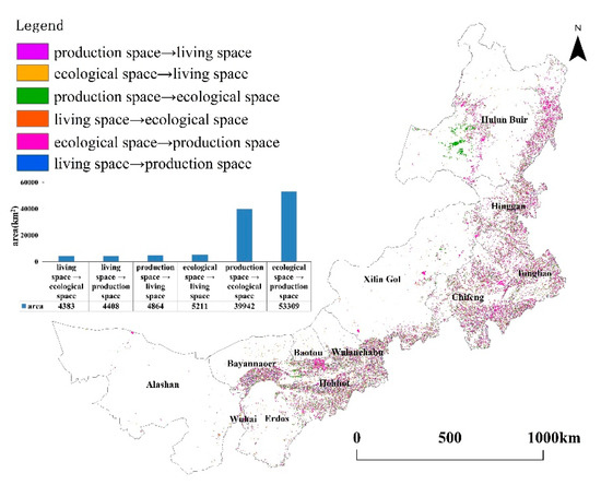 Several features were noted within the spatial patterns of EPLS in Inner Mongolia. The changes in EPLS indicate that there have been rapid increases in production and living spaces, whereas ecological spaces have continuously decreased. Within structural EPLS change, living spaces have always been focused within towns, with a strong path dependence characteristic, whereas production spaces are mainly distributed bordering living spaces, and even appear to be an expansion of the “enclave”-type space in which living and production spaces are nested and distributed within an ecological space, with the ecological space constantly fragmented by living and production spaces, and the degree of fragmentation becoming increasingly severe.