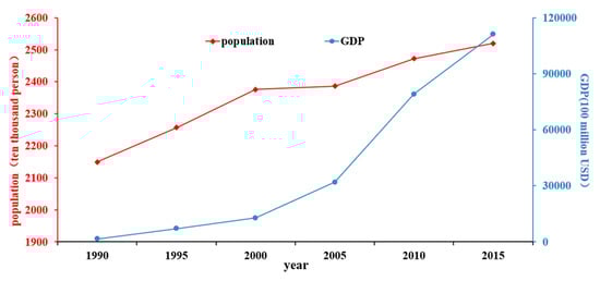 Changes in the gross domestic product (GDP) and population in Inner Mongolia during the period 1990–2015.