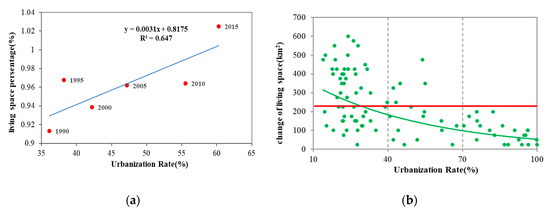 Relationship between urbanization rate and living space. (a) and the changes in living space (b) for 103 counties in Inner Mongolia. The red line indicates the average value of changes in living space in Inner Mongolia.