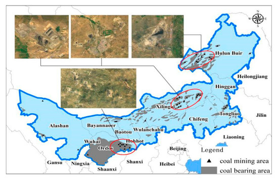 Inner Mongolia is rich in coal resources, with an estimated 7323 × 109 tons of confirmed coal reserves, thereby ranking first and second in China in terms of short-term and long-term coal reserves, respectively. Areas with coal resources in Inner Mongolia are generally placed into two categories, namely the low metamorphic bituminous coal area in Ordos and the lignite area in the eastern part of Inner Mongolia (Figure 10). Surface coal mining involves the extraction of coal from a shallow coal seam through open-pit mining. Large-scale surface coal mining has typically resulted in many negative ecological effects. Many studies have concluded that the process of mining compromises large areas of the ecological environment [32,33]. For example, the area of surface open-pit mining in Xilingol increased from 670.8 hm2 in 2005 to 6722.19 hm2 in 2015 [34]. At the same time, the exploitation of mineral resources has provided the economic foundation for increasing the level of urbanization, and there are many examples of rejuvenation of cities due to exploitation of coal, such as occurred in the city of Bayanhua [35,36]. In summary, the development and utilization of coal resources plays an important role in regional changes to EPLS, with ecological spaces reduced and living and production spaces expanded.