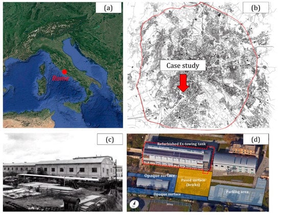 Location of the city of Rome (a); location of the case study in Rome (b); the old (c) and the renewed (d) towing tank building (an elaboration from []).