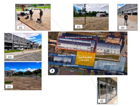 On-site measurements (a,b); views of the paved surface (c,d); views of the ex-towing tank building (e,f). The arrows point out the areas examined in the plan.