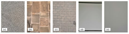 Case study materials: asphalt (a); large bricks of the paved surface (b); small bricks of the paved area (c); external panels of the sheds in front of the ex-towing tank building (d); panels of the ex-towing tank building (e).