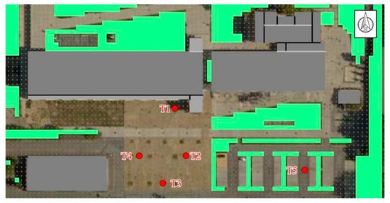 The model was created by means of ENVI-met software (ENVI_met GmbH, Kaninenberghöhe 2, 45136 Essen, Germany), which is based on the Soil, Vegetation and Atmosphere Transfer model (SVAT). The geometrical model is presented in Figure 5, where the current situation of the investigated area is shown, also reporting the receptors T1, T2, T3 and T4 where the air temperature measurements were carried out for the calibration of the model. Figure 5 also shows the receptor T5, useful as a representative point for the simulation results related to the parking area.