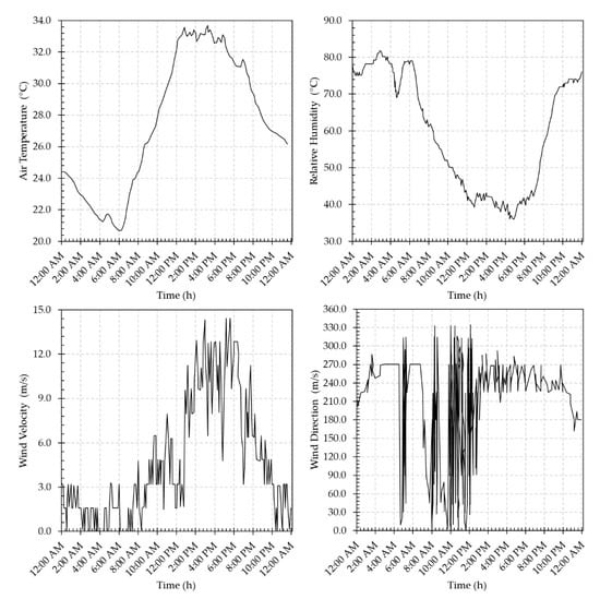 The input parameters applied in the model are listed in Table 2. As previously mentioned, the hourly relative humidity, the average wind speed and the average wind direction were obtained from a weather station located near the investigated area (about 1.5 km away). In Figure 6 are reported the weather data taken into account. Simulations were performed from 6:00 p.m. of 21 July 2019 till to midnight of 22 July 2019, for 30 h of continuous simulation. The initial 6 h can be considered essential for solving the preliminary transient period. Thus, an entire day can be simulated. In Table 2, it is indicated that both air temperature and relative humidity at an altitude of 2 m are “forced” at the boundary, where the air flow crosses the domain (South-West side). This is necessary to reproduce the daily air temperature and relative humidity variation. The air temperature values are the results of the measurements taken in the receptors T1, T2, T3 and T4, and were changed hour by hour during the calibration phase.