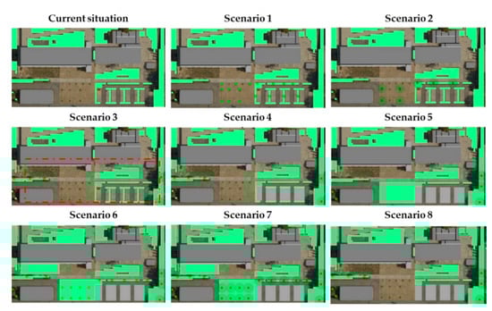 The corresponding ENVI-met models for each described scenario are shown in Figure 7.