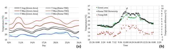 Comparison between external air temperatures registered in Roma TRE University and in a green neighborhood in Rome during the first measurement campaign conducted in June 2018 (a) and registered on 11 June 2018 (b).