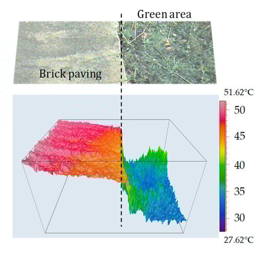 During this first step, a preliminary thermographic analysis was conducted, taking a photo straddling the paved area and a part of the small flowerbed covered with grass. The result of this comparison is shown in Figure 9, where it is possible to notice a temperature reduction of about 12 °C, suggesting that growing the greenery can lead to lower temperatures and more comfort, with better environmental conditions. The result shown in Figure 9 is predictable, but in the analyzed case study, the issue is related to the effect of this predictable result when lawn is applied on a large scale in terms of air temperature distribution. This can be simulated only through calibrated numerical models.