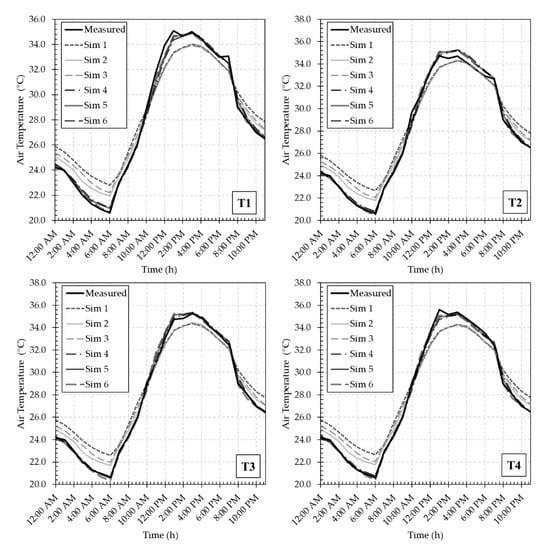 The numerical model was calibrated by means of experimental data in four different points (previously called receptors T1, T2, T3 and T4). The calibration process consisted of the comparison between simulated and measured air temperatures, calculating the Mean Absolute Error (MAE) and the Root Mean Square Error (RMSE). Figure 10 provides the comparison among measured air temperatures and temperatures obtained by different simulations (in the picture, these simulations are called Sim, followed by the simulation number). Table 3 lists the MAE and the RMSE for each simulation. Several atmospheric quantities are required for running the model, and the calibration process is the results of the variation, step by step, of the forced air temperature set on the boundary of the computational domain. For all the receptors, the last simulation (called Sim 6) allowed to obtain the lower values of the Mean Absolute Error (equal to 0.20) and the Root Mean Square Error (equal to 0.27).