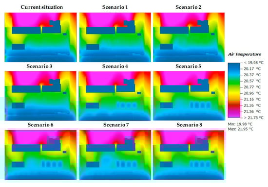 The obtained results concern the comparison between the current situation and the simulations with the selected mitigation techniques. Figure 11, Figure 12 and Figure 13 show the air temperatures at a height of 1.5 m above the ground, respectively, at 6 a.m., 12 a.m. and 6 p.m. In Figure 14 and Figure 15 are reported air temperature results on receptor T2 and T5. The average and maximum air temperature differences between the current situation and the specific scenario in the receptors T2 and T5 are listed in Table 4.