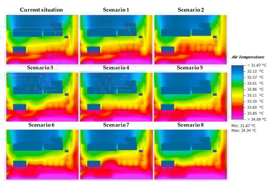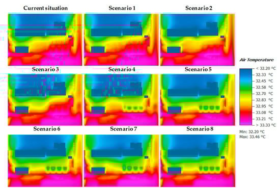 Comparison of the air temperature between the current situation and the proposed scenarios inside the parking area (point T5).