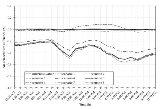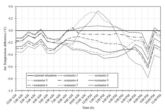 Focusing on the results related to the paved surface area, it is possible to notice that all the mitigation techniques led to a decrease of the air temperature in terms of daily average values. In particular, the results shown in Figure 11 and Table 4 allow to observe daily average air temperature decreases ranging from −0.28 °C to −0.03 °C, with maximum differences from −0.28 °C to 0.78 °C. During the hottest hours of the day (see Figure 10), it is possible to notice that the adoption of trees with a height of 5 or 15 m led to an increase of the air temperature due to their capability to hinder the wind, that in these hours, has more importance instead of their shading effects. The use of cool pavements decreased the daily average air temperature of −0.22 °C, reaching the maximum values during the hottest hours of the day. The use of a canopy in the parking area did not lead to a noteworthy air temperature variation on the paved surface area. The introduction of lawn (Scenario 5, Scenario 6 and Scenario 7), instead of the use of cool pavement, led to the air temperature reduction throughout the day and, despite Scenario 3, reached the maximum air temperature decrease during the evening.