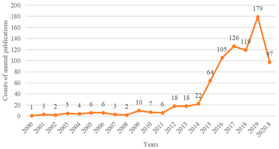 As shown in Figure 1, the research on mobile technology in tourism can be divided into three stages. The first stage is from 2000 to 2011. At this stage, scholars conducted very limited research in this field. The second stage is from 2012 to 2014. During these three years, the number of related studies increased, but the growth was still slow. The third stage is from 2015 to the present, and the number of related studies has shown a steady and rapid growth trend. After analysis, the research of mobile technology in tourism and the development of mobile technology are synchronized to a certain extent. The beginning of the fourth-generation mobile communication (4G) era is 2010. From this period, mobile technology has gradually been used more widely in various areas. Therefore, the adoption of mobile technology in tourism has increased, and the number of related studies has also increased. Now that people have ushered in the 5G era, the concept of the Internet of Everything will be further reflected in people’s daily life and work. Thus, research on mobile technology in tourism may continue to rise, and new research perspectives will emerge. Furthermore, iPhone appeared in 2007 and Android in 2008, with smartphones becoming popular as of 2011 [39]. That explains, to a large extent, the little literature in this research field before 2012. That is, the use of advanced mobile technologies in tourism was much more limited before a large part of tourists had a smartphone.