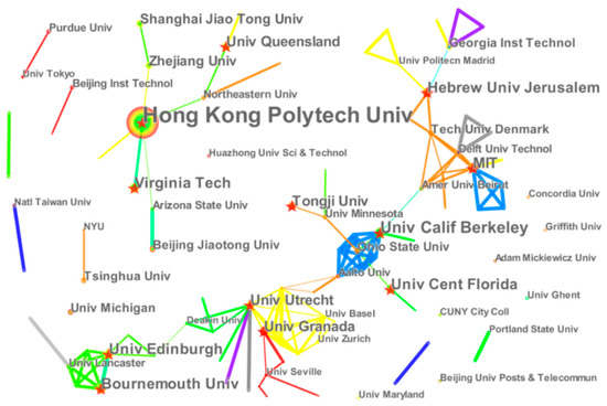 In the reviewed literature, approximately 982 institutions have participated in the research of mobile technology in tourism. Hong Kong Polytechnic University has outstanding performance in many research areas including engineering, computer science, and materials science. Moreover, this university has achieved good results in the research of mobile technology in tourism. The institution has published the largest number of articles in this research field and has 12 years of Half Life, which shows that it has a long-term influence on this research field. The burst value indicates the emergency situation of the institution during the review period. Generally, the institution has published several studies in the research field or has had a greater influence on the research field in a period of time. Among the top 12 institutions in the number of publications, the University of Central Florida has a high burst value (3.64). Figure 2 presents the institution collaboration network in this research field. On the whole, although a relatively stable institution cooperation network exists, many organizations still only cooperate within their organizations or with people from a fixed organization. Among them, the institutions with the most publications often have extensive cooperation relationships with other institutions. For example, the important partners of Hong Kong Polytechnic University are Virginia Polytechnic Institute and State University, Arizona State University, Zhejiang University, and Northeastern University. The University of California-Berkeley has established cooperation with eight organizations: the American University of Beirut, The Ohio State University, CIBER Epidemiology and Public Health, Melonic Technology Limited, Museo Galileo, INRIA Rennes Bretagne Atlantique, Heritage Malta, and Aalto University.