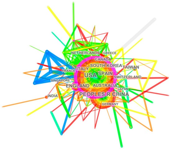 Countries/regions’ collaboration network of some high co-occurrence counts.