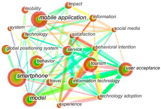 One can grasp the research hotspots and frontiers in this field by interpreting the visualized knowledge mapping of keywords in mobile technology research in tourism. Figure 4 describes the top 20 keywords of mobile technology research in tourism, which to a large extent represent research hotspots in this field. “Smartphone,” “mobile application,” and “user acceptance” are the three most frequent and meaningful words, representing the three most popular topics in this field. In addition, “model” indicates that in the research of mobile technology in tourism, researchers often combine theoretical models for related research. After the analysis, the technology acceptance model is the most commonly used theoretical model.