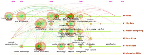 Figure 5 reflects the changes in the main research content of this field over time. The red text labels on the right side of the figure are the cluster labels of keywords, and the black text labels on the left horizontal line are some of the main keywords in the keyword cluster. The larger the node corresponding to a keyword, the more research that has been conducted around the keyword. In addition, the position of the keywords on the horizontal line corresponds to the year when these keywords first appeared. For example, “user acceptance” is located below 2010; it reveals that the keyword first appeared in 2010. “Big data” roughly corresponds to the period between 2017 and 2018, pointing out that the first time it attracted widespread attention was in 2017; “gamification” is located below 2019, indicating that it has gradually attracted the attention of academia in 2019. The findings of the study clarify that before 2012, research on mobile technology in tourism was limited, and the main focus was on mobile devices, technologies, and services and the attitude and acceptance of users. After 2012, scholars have gradually increased their research in this field, and the types of keywords have become increasingly diverse. The keywords after 2017 present the current research frontiers in this field, such as “gamification,” “big data,” “smart tourism,” and “perceived risk.”