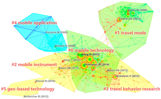 A total of 803 references cited 28,652 references. Keyword information was extracted to generate a co-citation cluster map of the literature on mobile technology research in tourism. Modularity Q = 0.7957 > 0.4 and Mean Silhouette = 0.663 > 0.5 of the cluster map indicate that the clustering results are of quality. Figure 6 depicts the largest subnet of co-cited references. The cluster label points out that mobile technology, travel mode, mobile instrument, travel behavior research, mobile applications, and geo-based technology are the foundations of mobile technology research in tourism. The Mean Silhouettes of the six clusters are all greater than 0.7, indicating that the clusters have high homogeneity (Table 3).