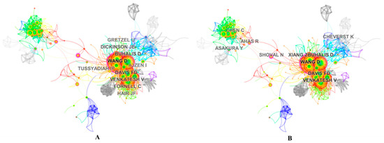 Visualization of the author co-citation network: (A) Top 10 authors in terms of co-citation counts; (B) Top 10 authors in terms of co-citation centrality.