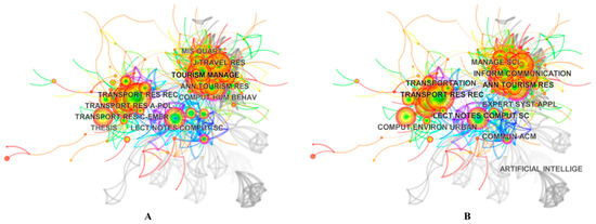 Figure 8A,B respectively illustrates the top ten journals with the most co-citation counts and the strongest co-citation centrality. The depth of the label color and the size of the node demonstrate that Tourism Management, Transportation Research Record, and Transportation Research Part A: Policy and Practice are among the top three in terms of co-citation counts; the top three journals in terms of centrality are Communications of the ACM, Annals of Tourism Research, and Lecture Notes in Computer Science. These journals have a great influence on the research foundation of mobile technology in the tourism field. Similarly to Figure 7, Figure 8 also has a variety of line colors, which indicates that journals have also been co-cited over a relatively long time and at multitudinous points in time.