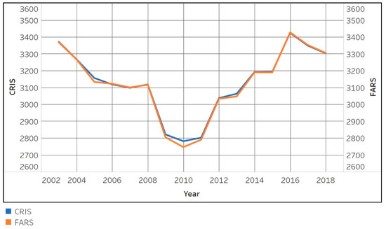 - National Center for Statistics and Analysis. Fatality Analysis Reporting System (FARS) Analytical User’s Manual, 1975-2018; National Highway Traffic Safety Administration: Washington, DC, USA, 2019. [Google Scholar]