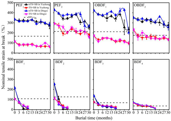 Application of TS lowered the initial εtb of the films by 9–66%. Initial εtb differed markedly between TS-treated and untreated films, and at the end of the experiment, final εtb of the TS and SB-treated films had declined to a greater extent than that of the nTS and SB films (p < 0.001 at two sites) (Table S1). Specifically, εtb of TS and SB-treated PEF and OBDF was reduced by 57–81% relative to the initial values, whereas that of nTS and SB films was reduced by only 15–52%. The 50% εtb value (50% reduction in εtb) is a standard measure of mechanical degradation [29]. The εtb of TS and SB-treated PEF and OBDF was near or below 50% εtb, whereas that of nTS and SB films (except OBDF1) was well above this level (Figure 1). In BDF, εtb decreased rapidly to levels far below 50% εtb, and its final values were not substantially altered by TS.