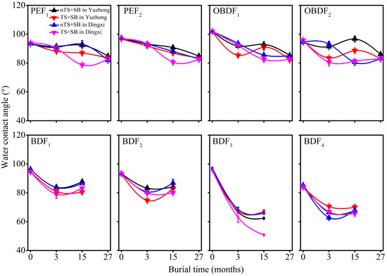 The three film types differed somewhat in initial WCA, and WCA of all films decreased with BT (p < 0.001 at two sites) (Figure 2, Table S1). The WCA of BDF decreased more rapidly than that of PEF and OBDF, TS and SB-treated plastic film samples had much lower WCA than nTS and SB samples, especially between 3 and 15 months. After that, the BDF samples had completely fragmented and could not be subjected to further WCA testing. For PEF and OBDF, the differences in WCA caused by the TS treatment were no longer apparent at the end of 27 months.