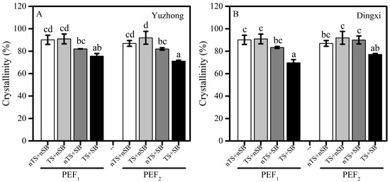 As shown in Figure 3, the combination of TS and SB significantly decreased the crystallinity of PEF (p ≤ 0.001 at two sites). In Yuzhong, compared with controls (nTS and nSB), the crystallinity values of nTS and SB-treated PEF1 and PEF2 was reduced by 8.9% and 5.7%, respectively, whereas that of PEF1 and PEF2 treated with both TS and SB were significantly reduced by 16.1% and 18.1%, respectively (Figure 3A). In Dingxi, the combination of TS and SB significantly reduced the crystallinity values of PEF1 and PEF2 by 22.7% and 11.2%, respectively, but the crystallinity of PEF treated with nTS and SB did not differ significantly from that of the controls (nTS and nSB) (Figure 3B).