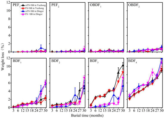 The weight loss of the three types of plastic film varied greatly after TS and SB in different months (Figure 4, Table S1). There were no significant differences in the weight loss of PEF and OBDF. However, for the four BDFs, weight loss increased with months of soil burial.