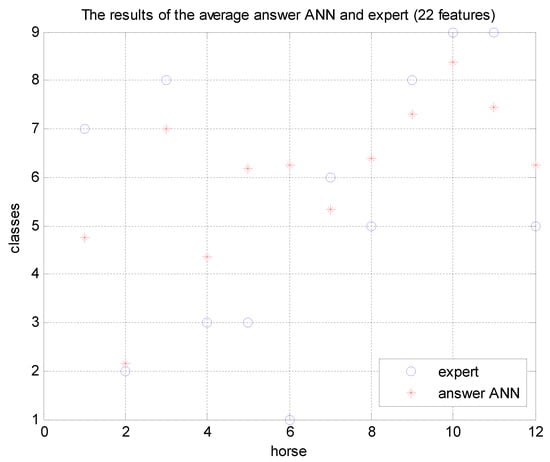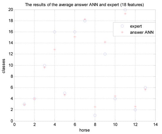 The arbitrary adoption of the number of classes in the current studies is a conventional assumption solely for the optimization of the functioning of artificial neural networks as an advisory system. Ten classes were suggested for the first model in the analysis conducted, but the output information obtained show that the proposed classification that relied on results obtained by Hucul horses was rather too general. The class difference between that given by the expert and the average of 10 network responses was too high and lacked repeatability (Figure 2).