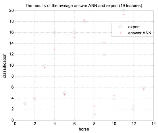 The input data were, in model 3, supplemented with additional information concerning the number of starts of each animal over the period covered by the analysis. The network configuration, in comparison with model 2, differed only by one size of the input vector, while retaining the 20 classes (Figure 4). With the application of 20 classes (expected data) and 19 features (output data) the maximum difference between responses of the artificial neural networks and the expert’s evaluation was 2 classes, namely in 2 instances, with the other responses being similar without exceeding 1 class. It is significant to note that the greatest difference observed in both trial models concerned the same instance. This probably indicates the high sensitivity of artificial neural networks to individual differences in certain features. It should be expected that the observed differences could also arise from a more objective evaluation and precise results of the network as against the expert’s rating. The high compatibility of responses by the artificial neural network with the expected assumptions at the preliminary stage of the study point to the factual possibilities of its practical application. This fact also drew the attention of Schobesberger and Peham [], who obtained a 78.6% compatibility while estimating the occurrence of lameness amongst trotters. The high level of compatibility obtained in the current studies is an indication of the propriety of choice of both the input model and the network structure. The high sensitivity of ANN to the information contained in the model was also confirmed in studies by Panchal et al. []. The ANN model designed with the mentioned studies was applied in cattle classification and to predict the occurrence of mastitis, relying on the parameters of milk quality being evaluated.