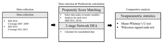 In order to fill the aforementioned research gaps, this study analyzed the effect of coopetition on research and development (R&D) productivity at two stages of the innovation process: (1) the value creation stage to develop new technology and (2) the value appropriation stage to generate profits. To identify those effects, this study evaluated 636 corporate samples, based on the 2010 and 2014 Korea Innovation Survey (KIS), through a propensity score matching (PSM) methodology. For measuring innovation performance, we used the two-stage network data envelopment analysis (DEA) methodology and quantified the productivity performance of firms along the entire innovation process and the two sub-phases. Then, we used the Mann–Whitney U and Wilcoxon signed rank test as a methodology for identifying the differences between coopetition and non-coopetition groups.