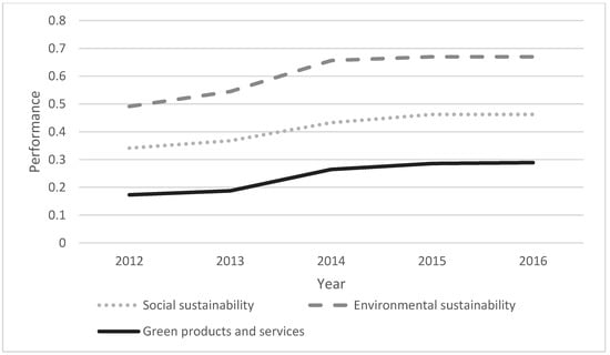In addition, Figure 1 shows that the development over time is very similar for all three categories. As tested above, the environmental sustainability category has the highest value before social sustainability and green products and services.