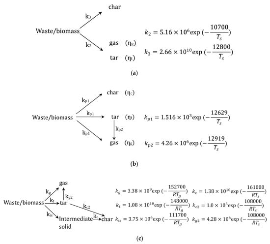 In this study, three different alternatives of pyrolysis mechanisms reported in the literature [16,25,26] were first examined in a simple laboratory furnace [31] to investigate the sensitivity of pyrolysis kinetics to the predictions by the waste bed model. The brief details of the three alternatives are shown in Figure 2.