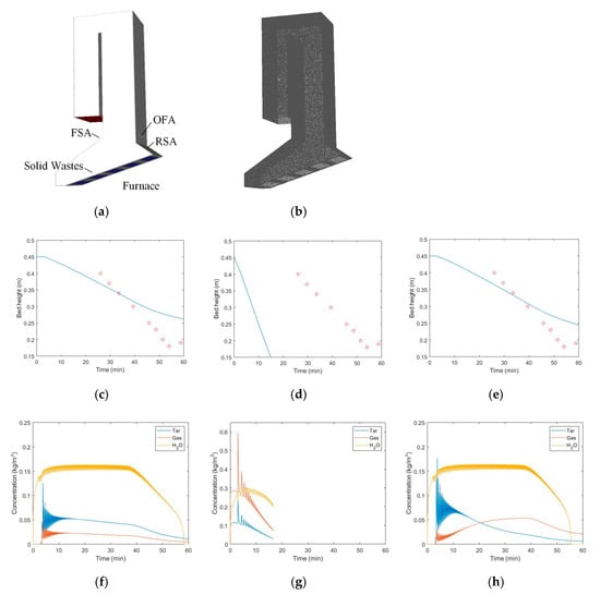 (a) Incinerator components. Secondary and over-fired air (OFA) entered the chamber through the secondary nozzles on the front (SFA) and rear (SRA) walls of the furnace; (b) computational mesh; and transient changes in the average bed height as well as the average solid and gas composition: (c,f) [16]; (d,g) [25]; (e,h) [26].