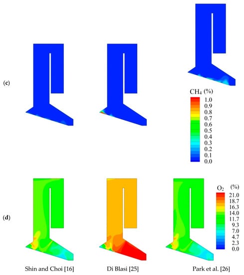 The temperature contours inside the furnace shown in Figure 4b illustrated a strong dependence on the pyrolysis mechanism. In the combustion region, the temperatures from [26] were generally higher than that of [16,25] with the maximum temperature around 1300 K in the rear region (above zone 5). The results were consistent with the observations from Figure 4c,d that [26] yielded more gas products and thus the combustion of these gases increased the temperature in the combustion region. Above the combustion region, [25] yielded the maximum temperature that was about 900 K. The higher temperature from [25] may be attributed to the weak flow inside the furnace due to a lesser amount of flue gases released from the waste bed, which slowed down the dissipation of the internal heat. The mass fraction contours of different gas compositions also corroborated with the temperature distributions. The concentration of CH4 predicted by [26] was higher but the corresponding mass fraction of O2 was relatively low, i.e., the oxygen had been exhausted by the combustion of methane. The additional heat generated by the methane combustion raised the temperature inside the furnace. In general, the observation showed that the flue gases from the waste bed increased the temperature in the combustion region.