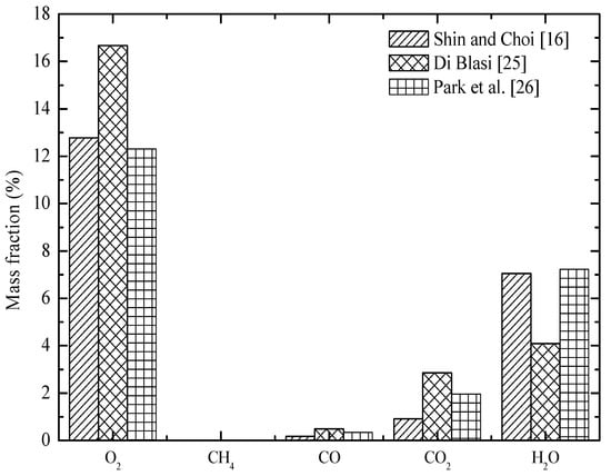 The gas emissions from the waste bed with the three different pyrolysis mechanisms are shown in Figure 5. The mass fraction of O2 from [25] was the highest (16.8%), indicating that the flue gases generated from the waste bed were predicted to be insufficient to consume the oxygen in the furnace. On the contrary, the low oxygen mass fraction and the high concentration of CO2 and water vapor from [26] implied the prediction of full combustion of the combustible gas products from the waste bed.